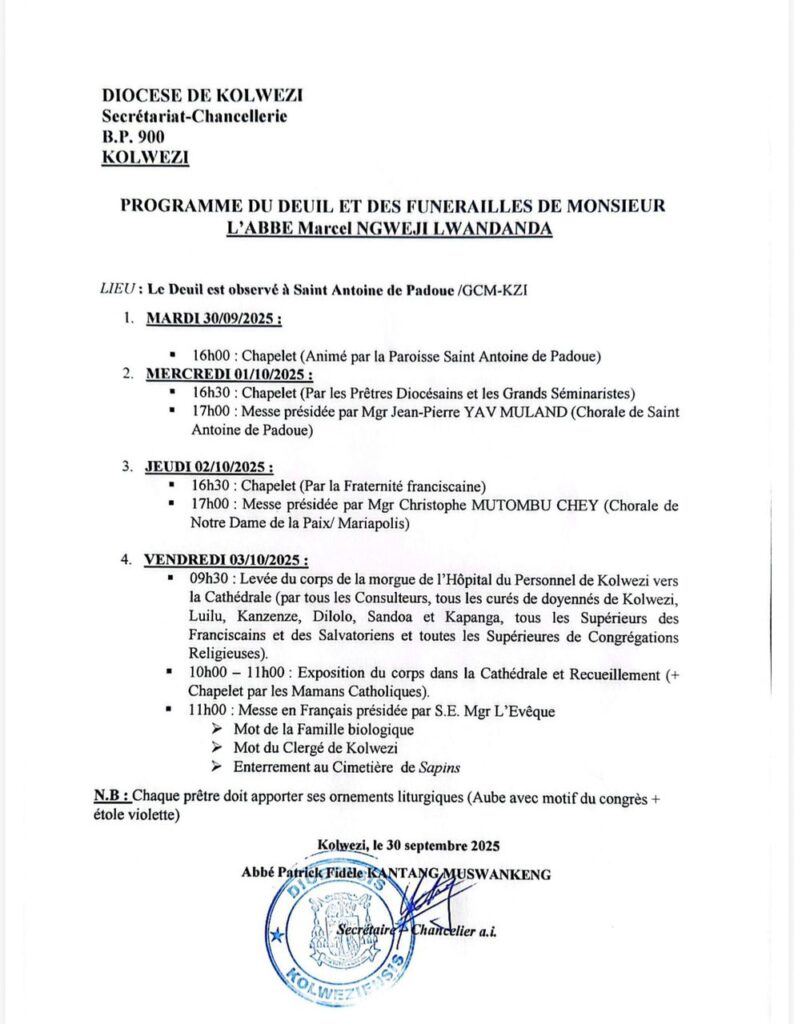 Diocèse de Kolwezi : Le programme des funérailles de l’Abbé Marcel NGWEJI